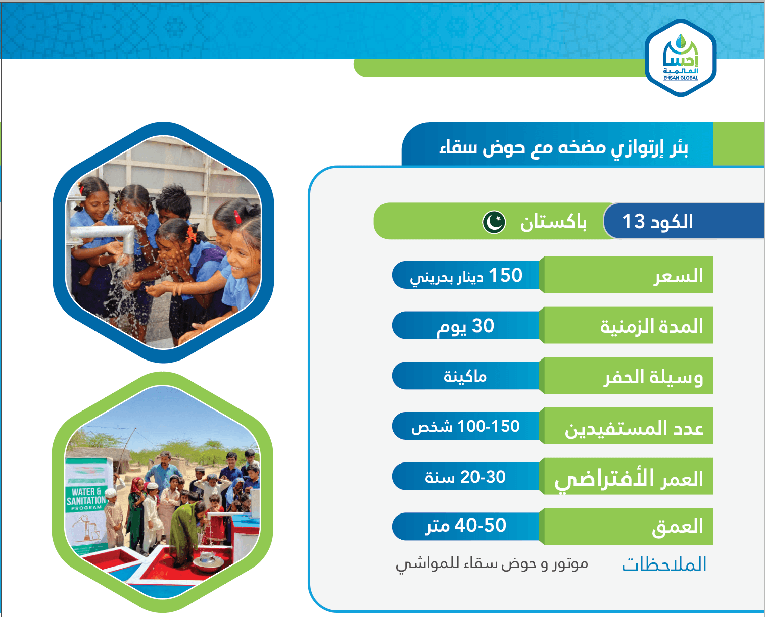 “بئر ارتوازي مزود بمضخة وحوض سقاء، يروي عطش القرى ويوفر مياهًا نقية لدعم حياة كريمة.”